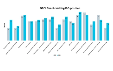 This was initially used to benchmark our I&D position as a baseline for how we're doing at GHD. We identified where GHD falls on 15 indicators across five levels of progress. In 2024, we reviewed our progress towards our 2025 goal of being between level 4 and 5.