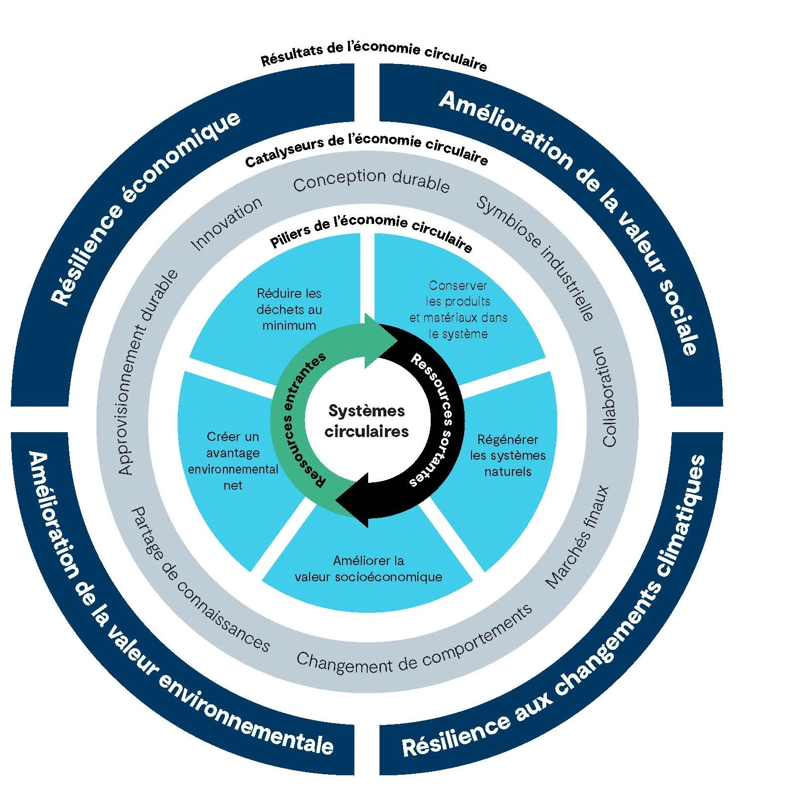 Cette approche nécessite des changements dans nos façons de planifier, de concevoir et d’exercer nos activités afin d’éliminer le concept de matières résiduelles, de reconnaître la valeur des ressources et de les conserver dans notre économie. En retour, cette approche créera un avantage environnemental et social net grâce à une activité économique régénératrice.